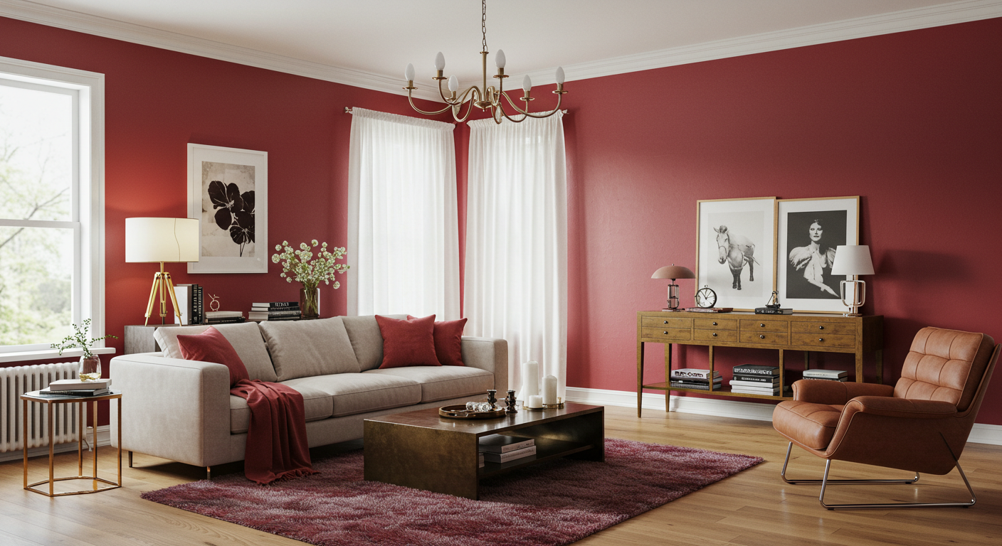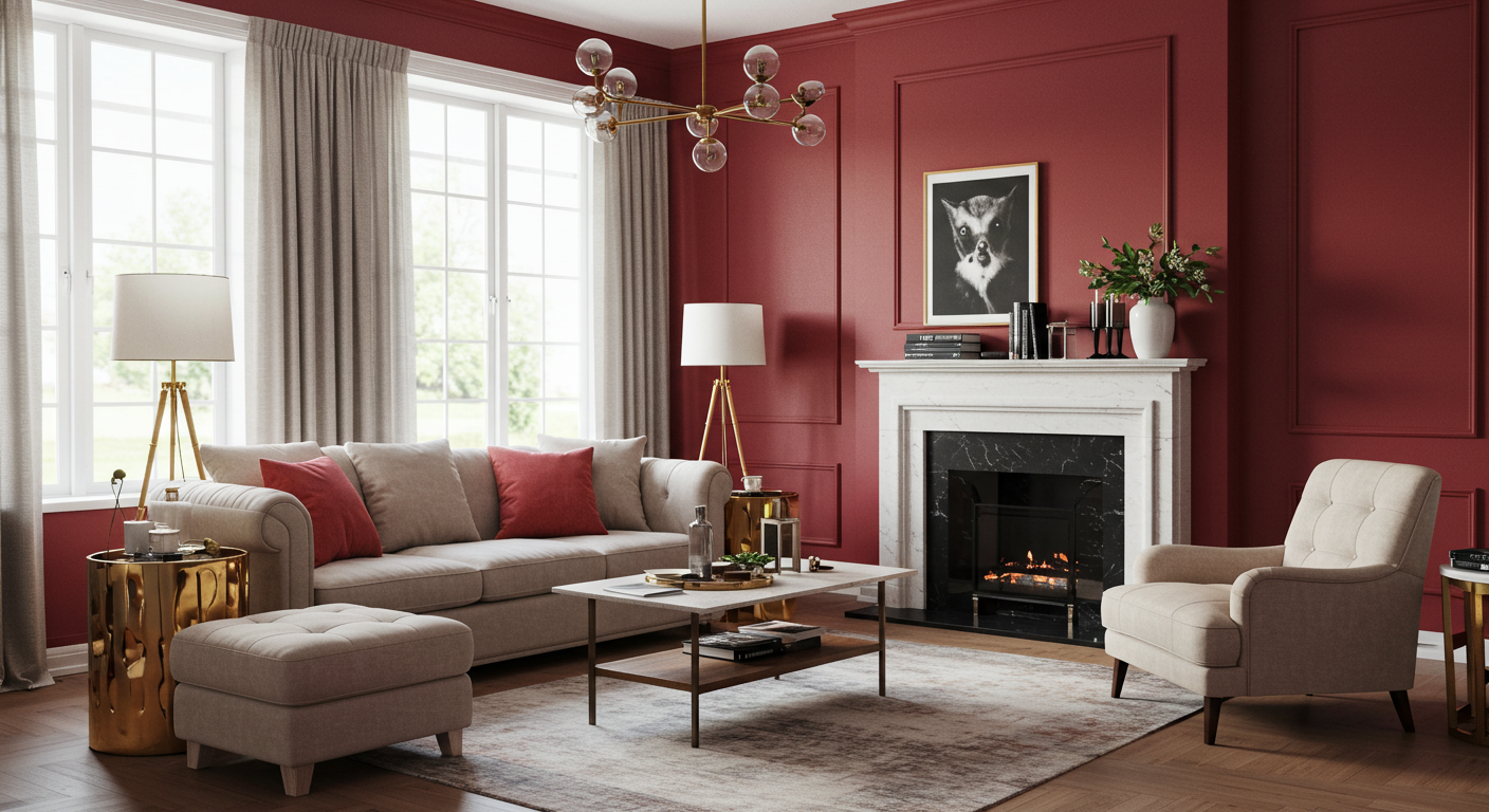 Lesson: Use the 60-30-10 rule: 60% dominant color (red walls), 30% secondary color (neutral furniture), 10% accent color (gold or navy).